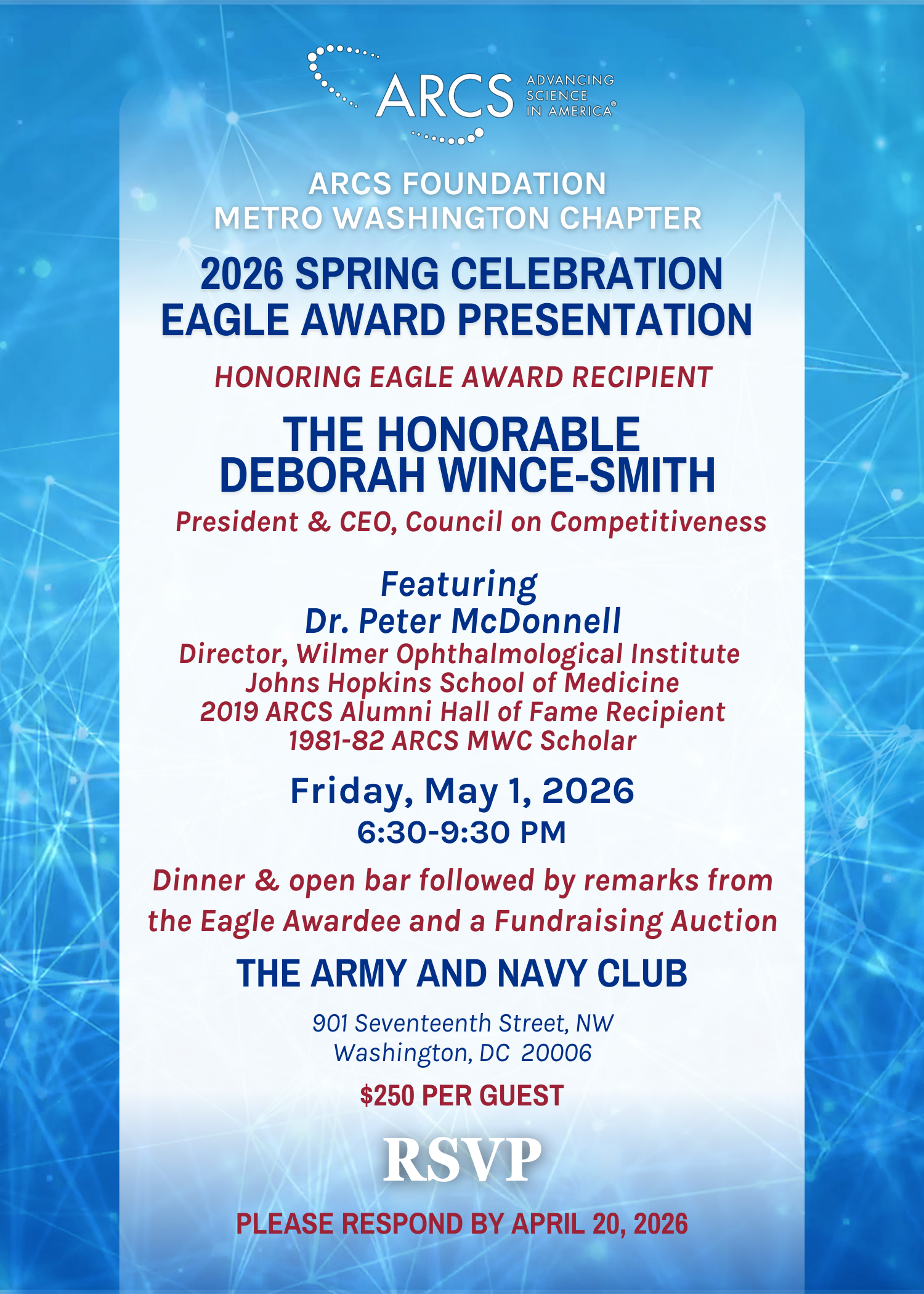 Washington, D.C. (August 15, 2025) - ARCS Foundation Metropolitan Washington Chapter (ARCS MWC) will host its 56th annual Scholar Awards Reception (SAR) at 6:30pm on Thursday, October 23, 2025, in The Great Hall and the Fred Kavli Auditorium at The National Academy of Sciences in Washington, DC. This premier event will honor... Read more