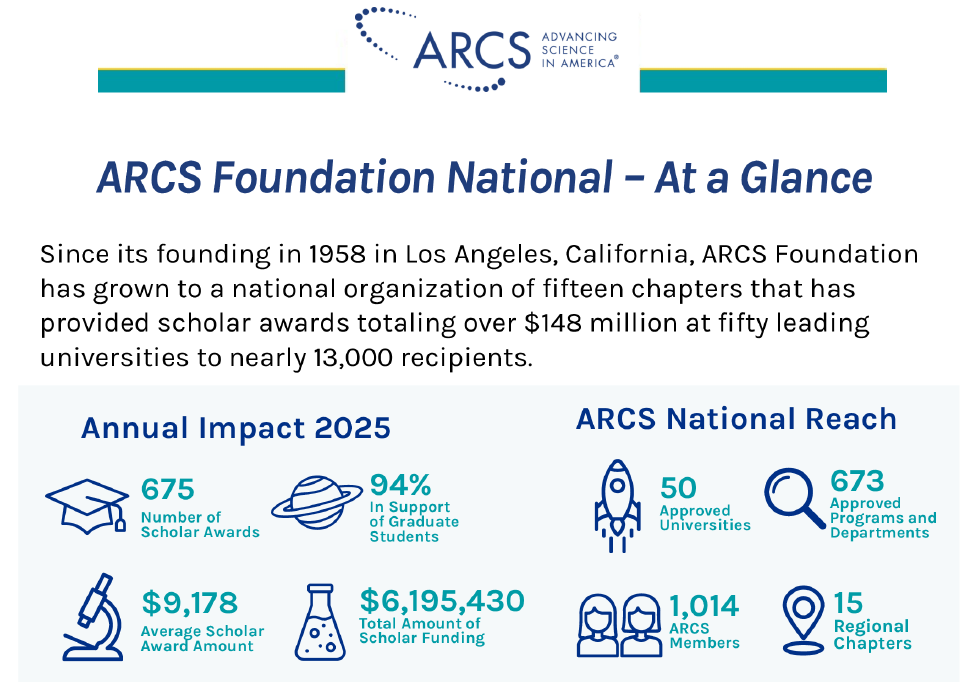ARCS provides a unique vehicle for channeling dollars into STEM (Science, Technology, Engineering and Math) education without deductions for administrative costs. ARCS Foundation gives 100% of all contributions donated for scholar awards to direct support of the scholars.