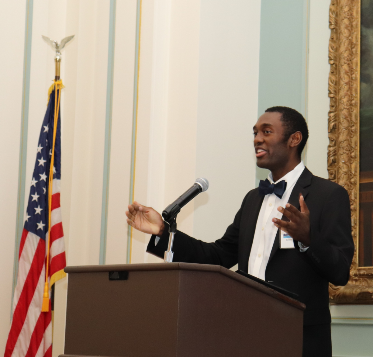 | Prachi Shah, MWC Chapter Scholar, discussing her research into understanding the neurobiological basis of memory disruption (forgetting). | DaVonne Henry, Hesse Endowment Scholar, discussing his work on high-density magnetic data storage and decreasing storage device size. |