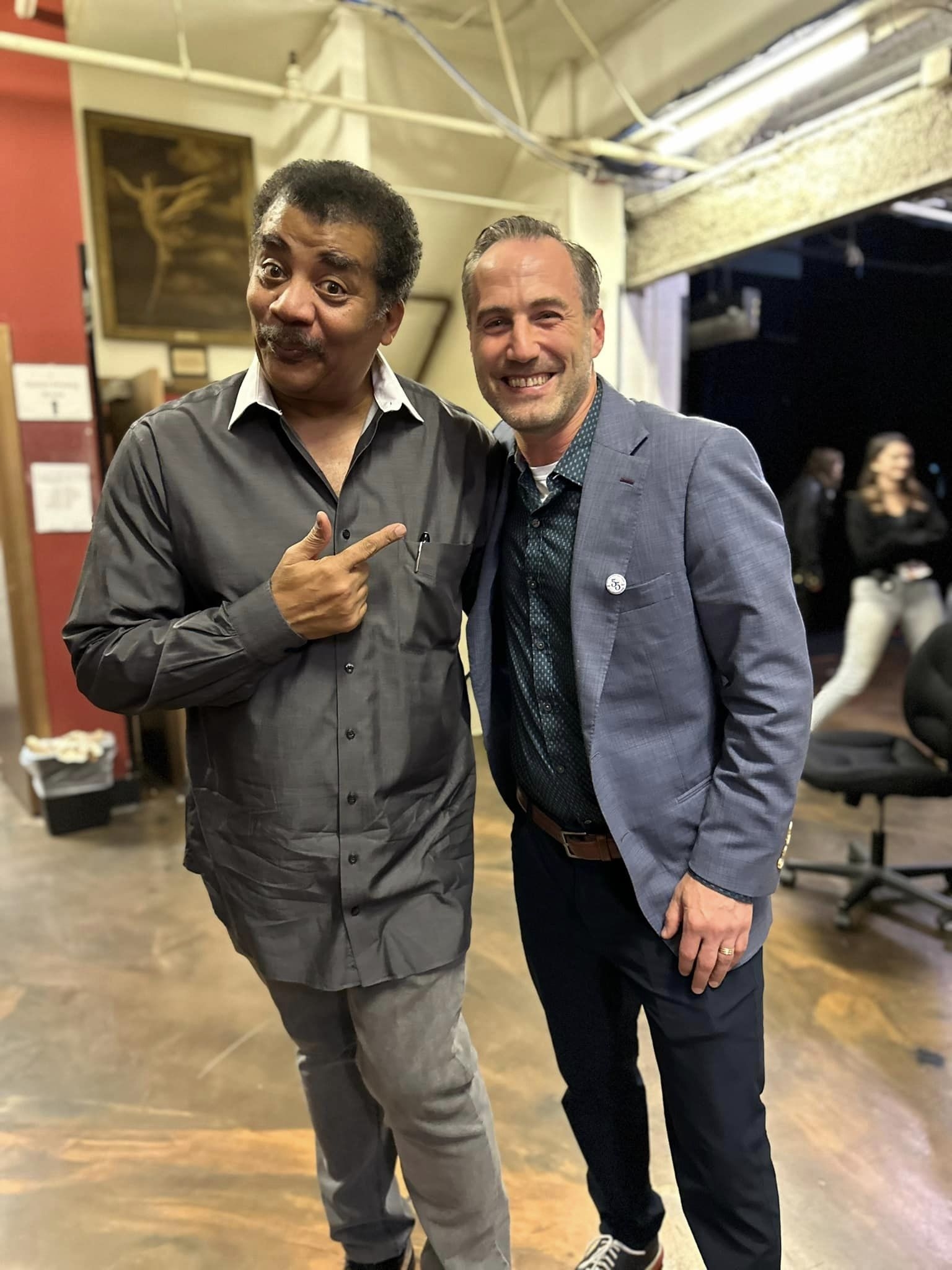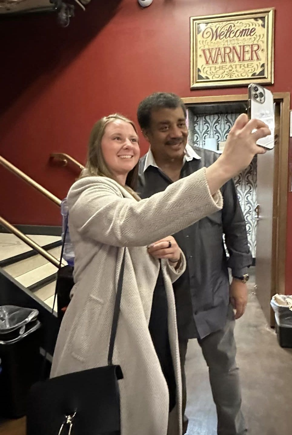 After mingling at The City Club of Washington, the attendees were escorted backstage at the Warner Theater to meet Dr. Tyson. He talked with the ARCS-MWC group for 25 minutes, including Dr. Ori Fox, another stellar astronomer and ARCS-MWC Scholar alum. Julie Hohl, Co-President of ARCS-MWC, recounts that Dr. Tyson said that his ARCS award greatly supported his academic career. After Patty Sparrell, Co-President of ARCS-MWC, concluded by thanking Dr. Tyson, he headed onstage for his show “Astronomy Bizarre,” cheered on by the enthralled ARCS-MWC attendees in the VIP section!